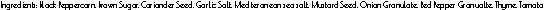 Ingredients: Black Peppercorn, Brown Sugar, Coriander, Garli, Sea Salt, Mudstard Seed, Onion, Red Pepper, Thyme, Tomato
